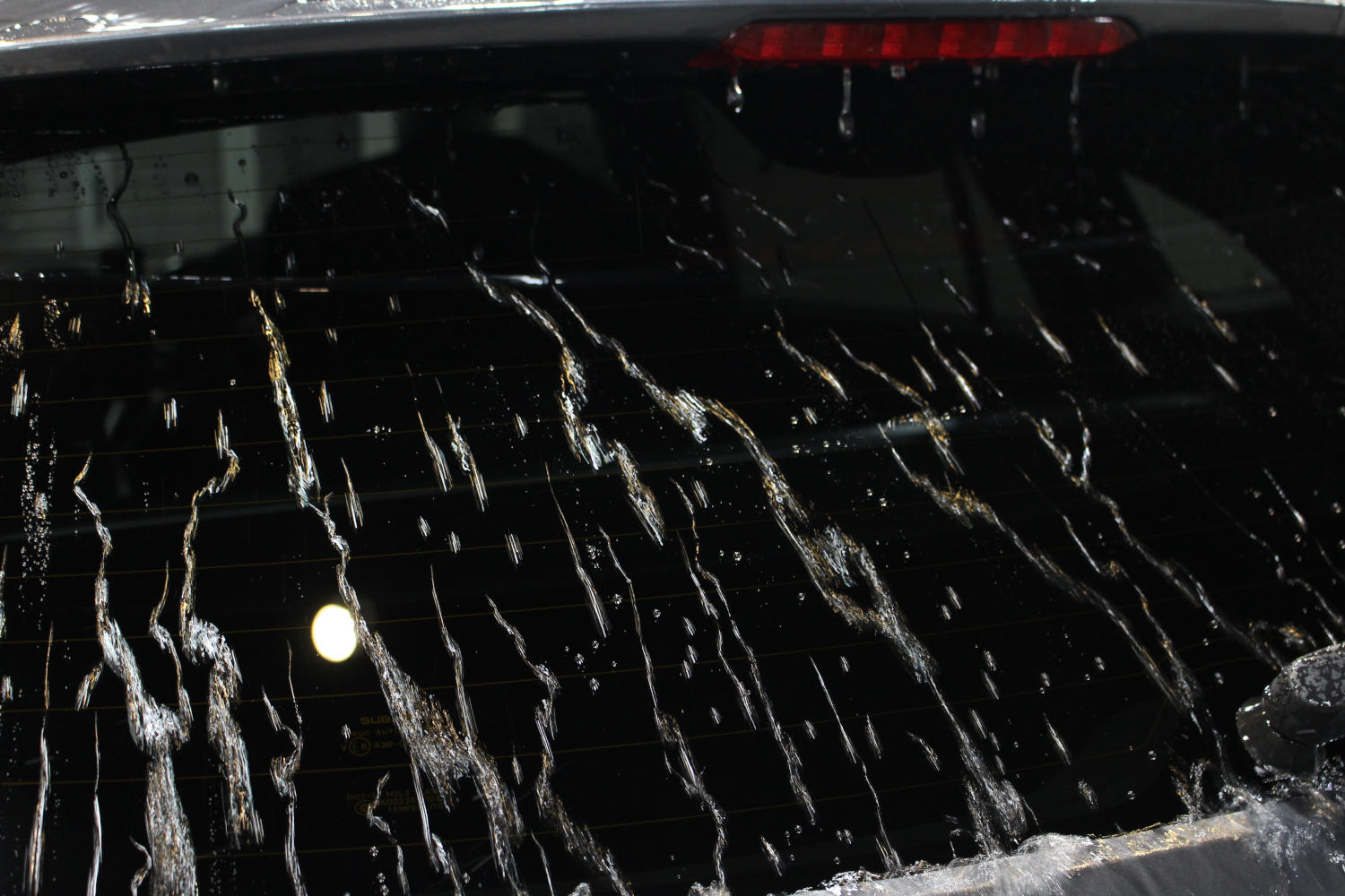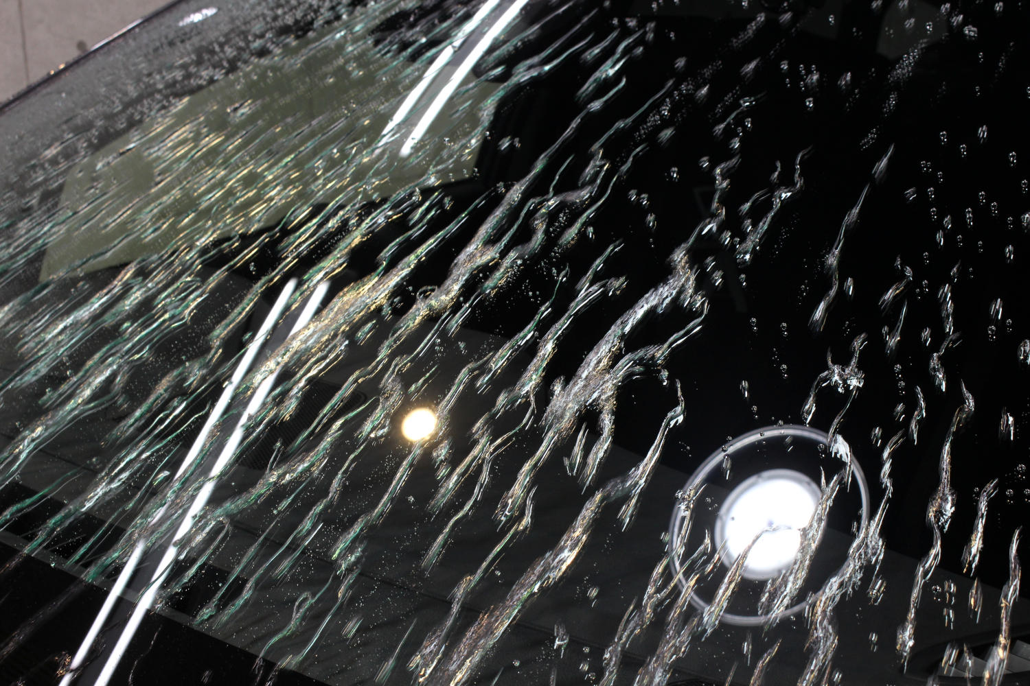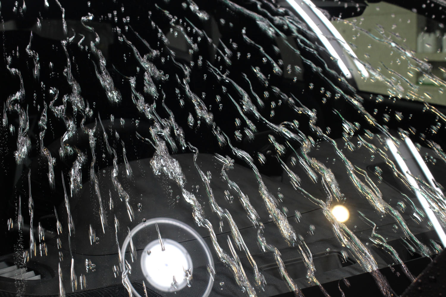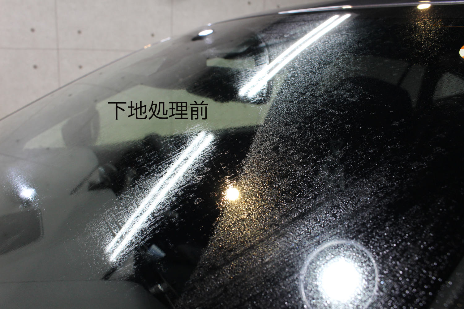 新車ご納車から時間を空けずにご入庫いただいたお車ですが、ご入庫時にオーナー様から「ワイパーをした際のガラスのシミがとても気になります」とお話をお伺いしました。不安定な天候の影響もありガラス全面がシミや油膜に覆われた状態で視界不良の状態でした。当店の窓ガラス撥水加工は新車、経年車問わず下地処理にて油膜、シミなどの付着物を落として施工しているためお車の美観維持だけでなく、雨天時の視界確保もしやすくなりオススメです。