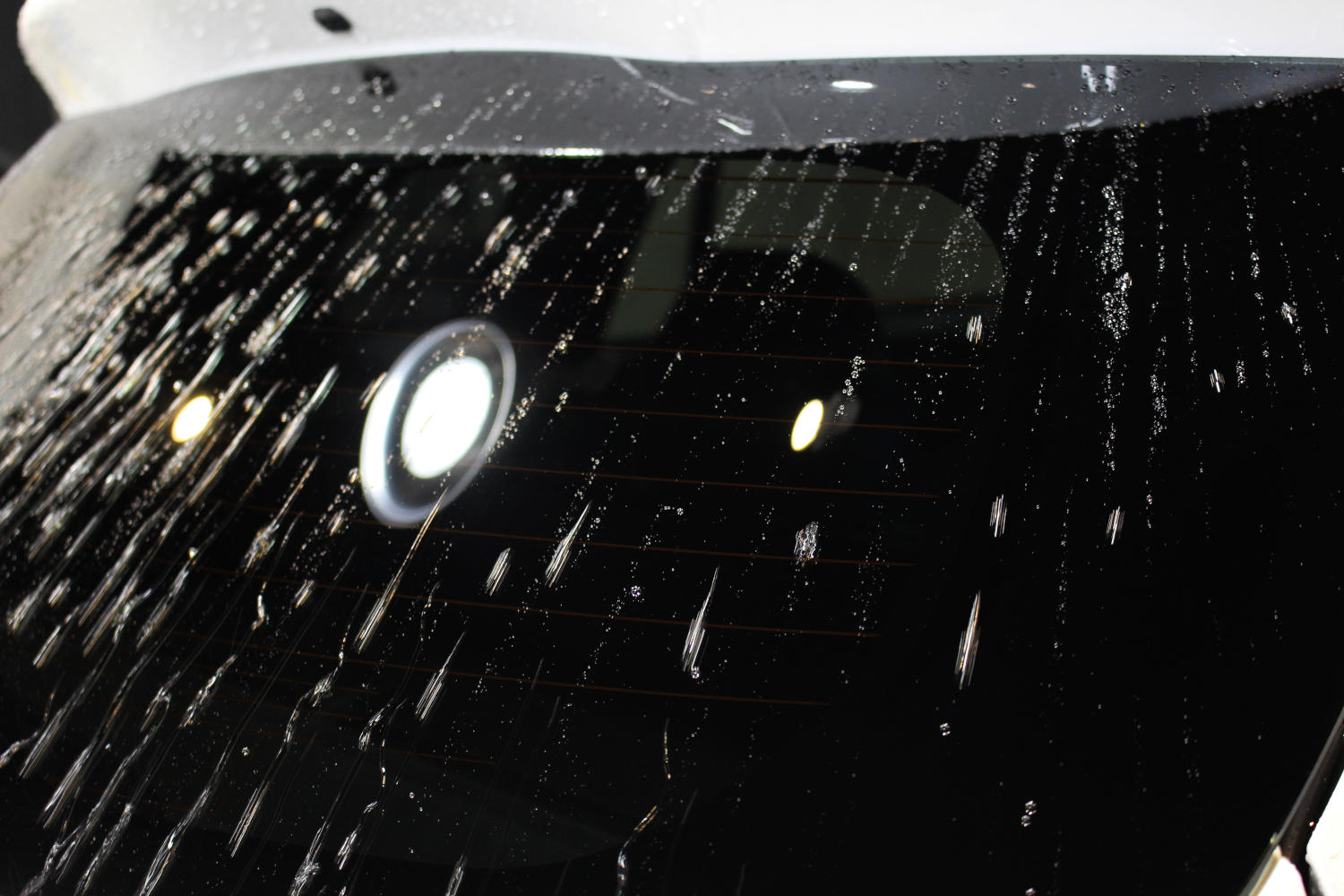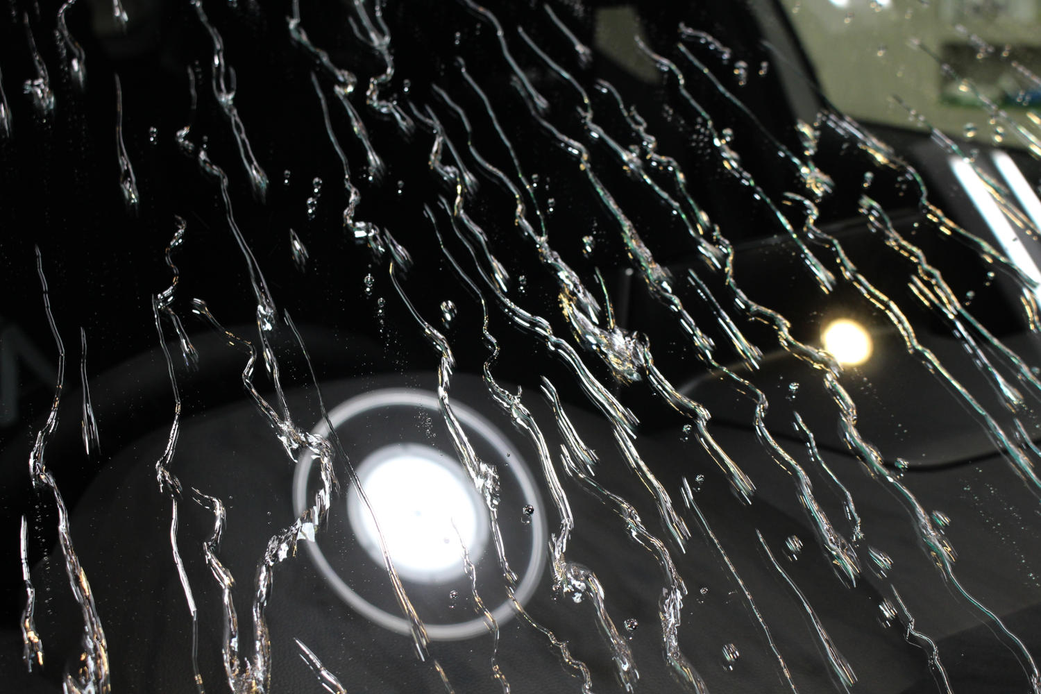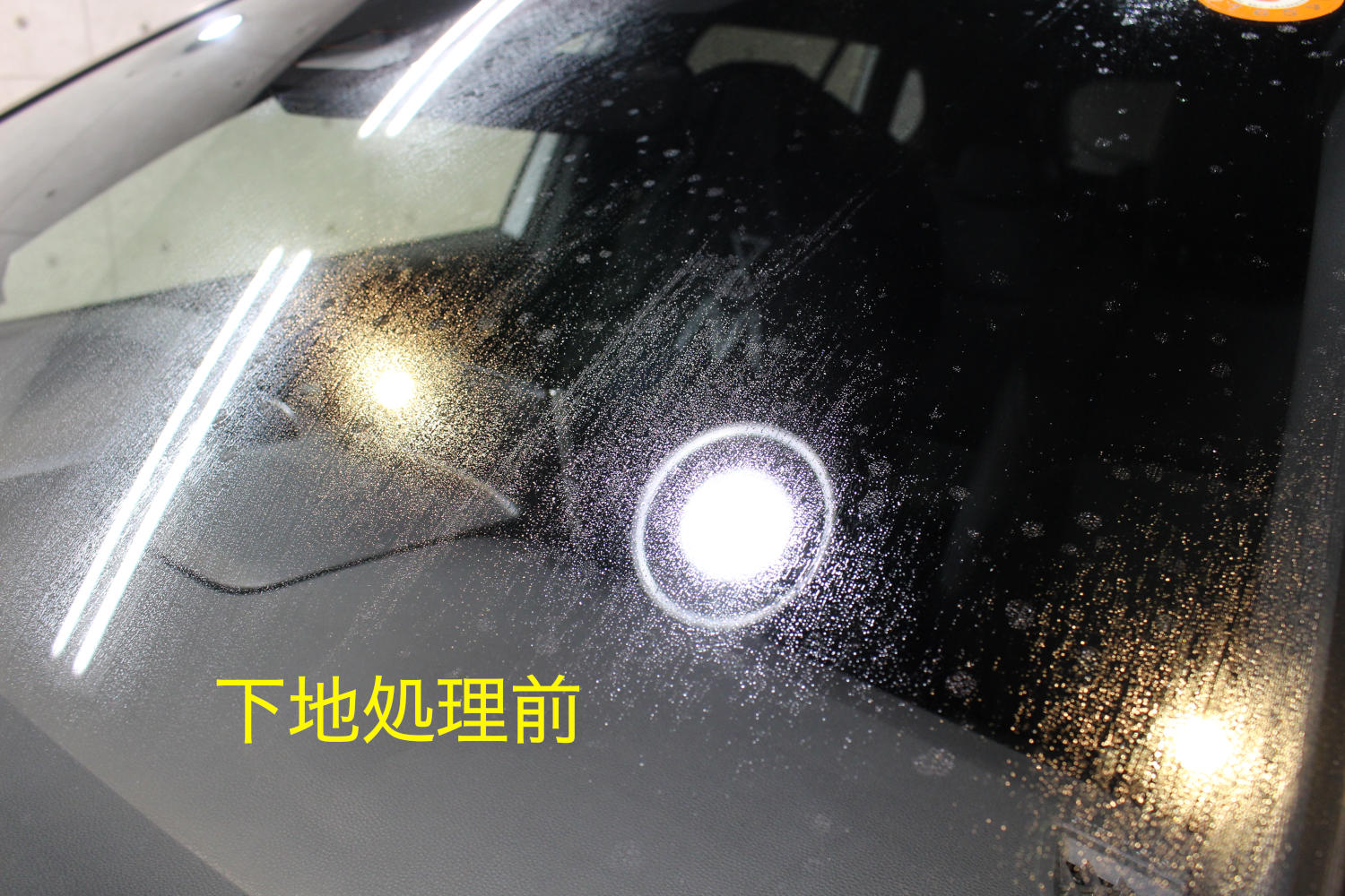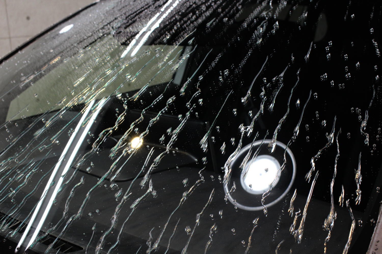 新車ご納車翌日にご入庫いただいたお車ですが既にガラス全面がシミや油膜に覆われた状態でした。当店の窓ガラス撥水加工は新車、経年車問わず下地処理にて油膜、シミなどの付着物を落として施工しているためお車の美観維持だけでなく、雨天時の視界確保もしやすくなりオススメです。