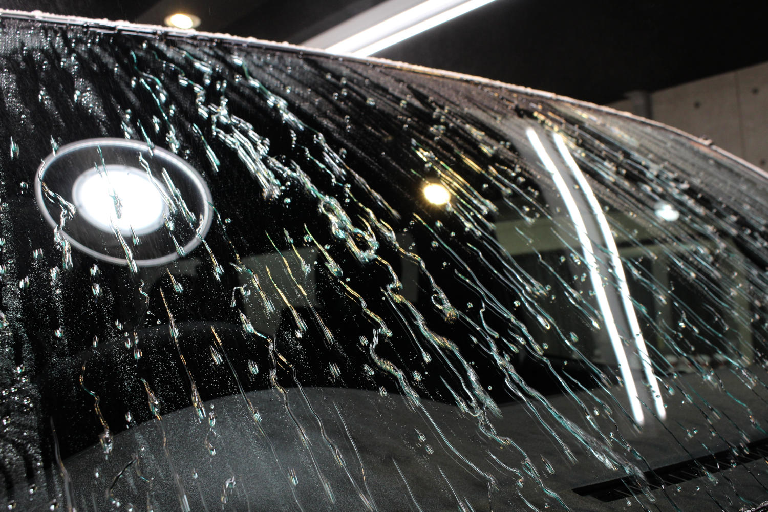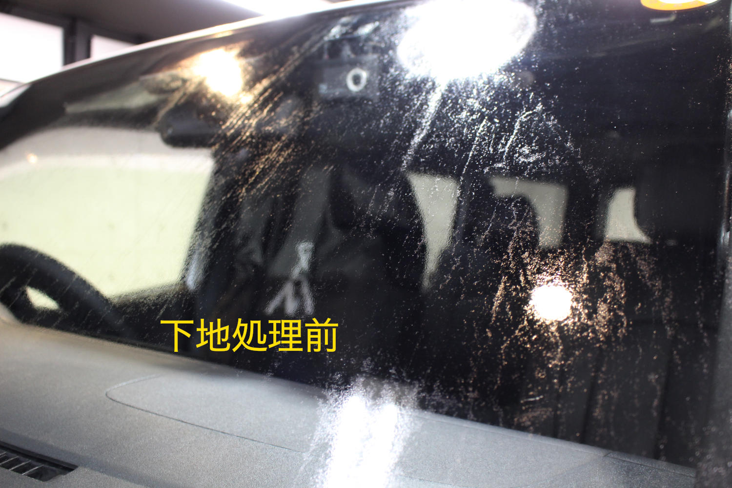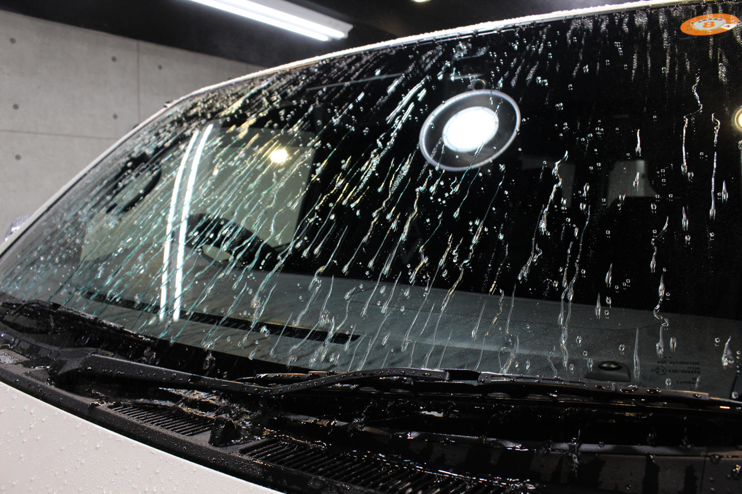新車ご納車後すぐにご入庫いただいたお車ですが時おり降る小雨や黄砂の影響もあり既にガラス全面がシミや油膜に覆われた状態でした。当店の窓ガラス撥水加工は新車、経年車問わず下地処理にて油膜、シミなどの付着物を落として施工しているためお車の美観維持だけでなく、雨天時の視界確保もしやすくなりオススメです。
