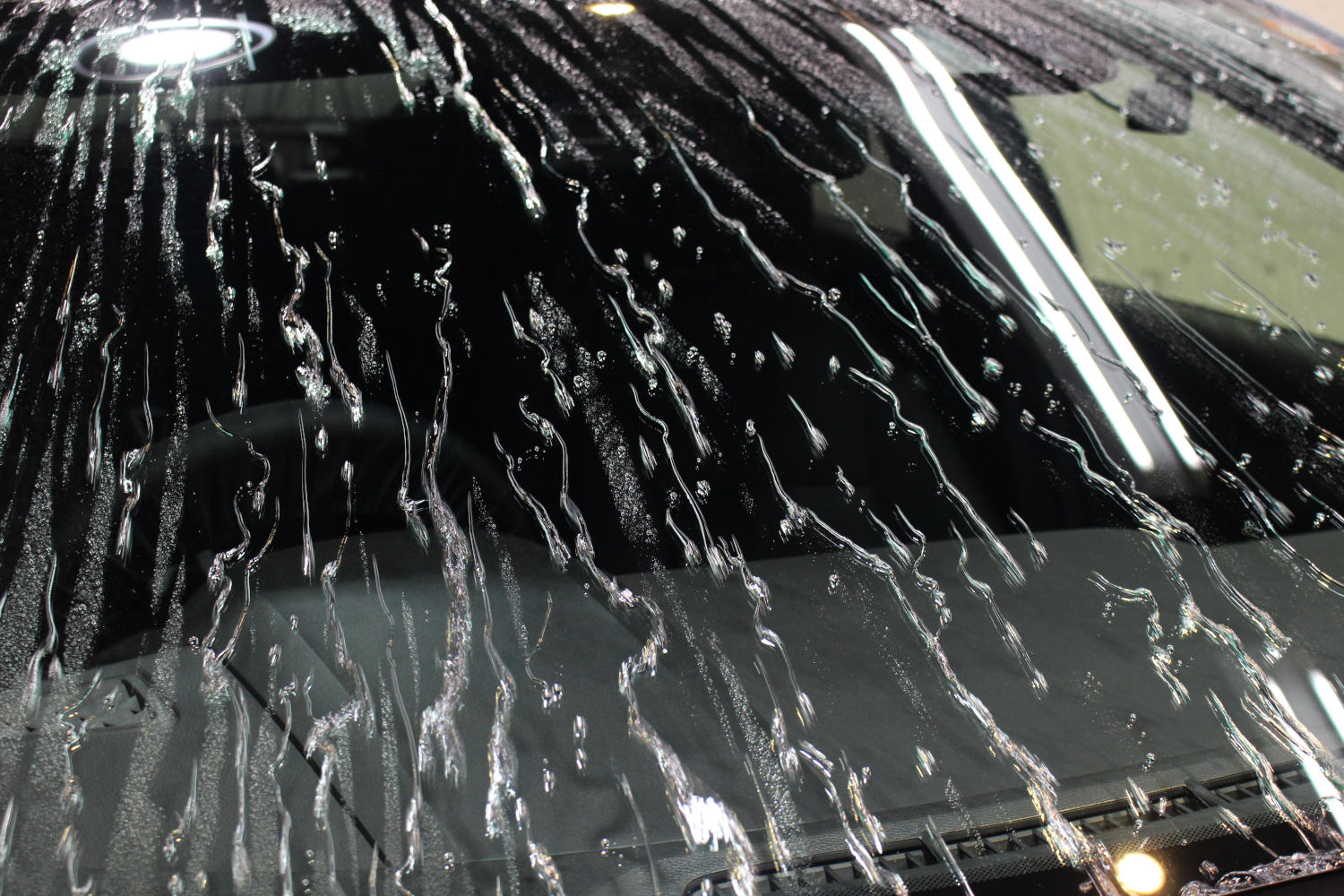 お車はオーナー様が新車でご購入され約5年となります。ガラスはシミや油膜で覆われ視界不良な状態でした。当店の窓ガラス撥水加工は新車、経年車問わず下地処理にて油膜、シミなどの付着物を落として施工しているためお車の美観維持だけでなく、雨天時の視界確保もしやすくなりオススメです。
