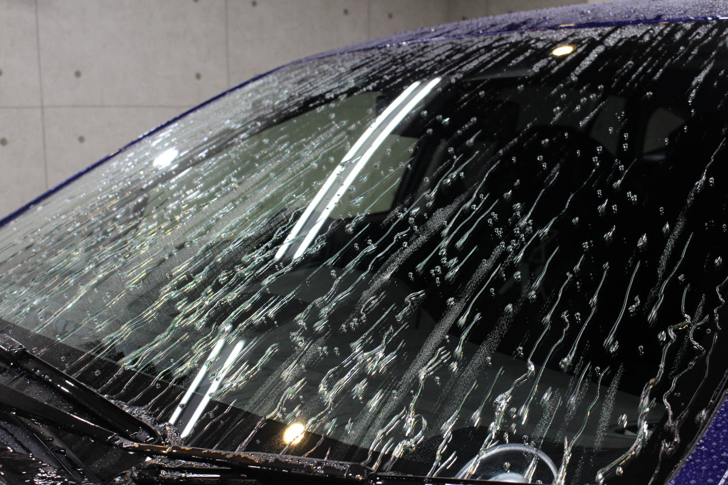 窓ガラス全面の撥水加工を行いました。窓ガラス撥水加工は、お車の美観を保つだけでなく雨天時の視界確保にも役立つため皆様にお喜びいただくオプションメニューの一つとなります。重度のシミが見られましたが、可能な限り除去して撥水加工を行いました。