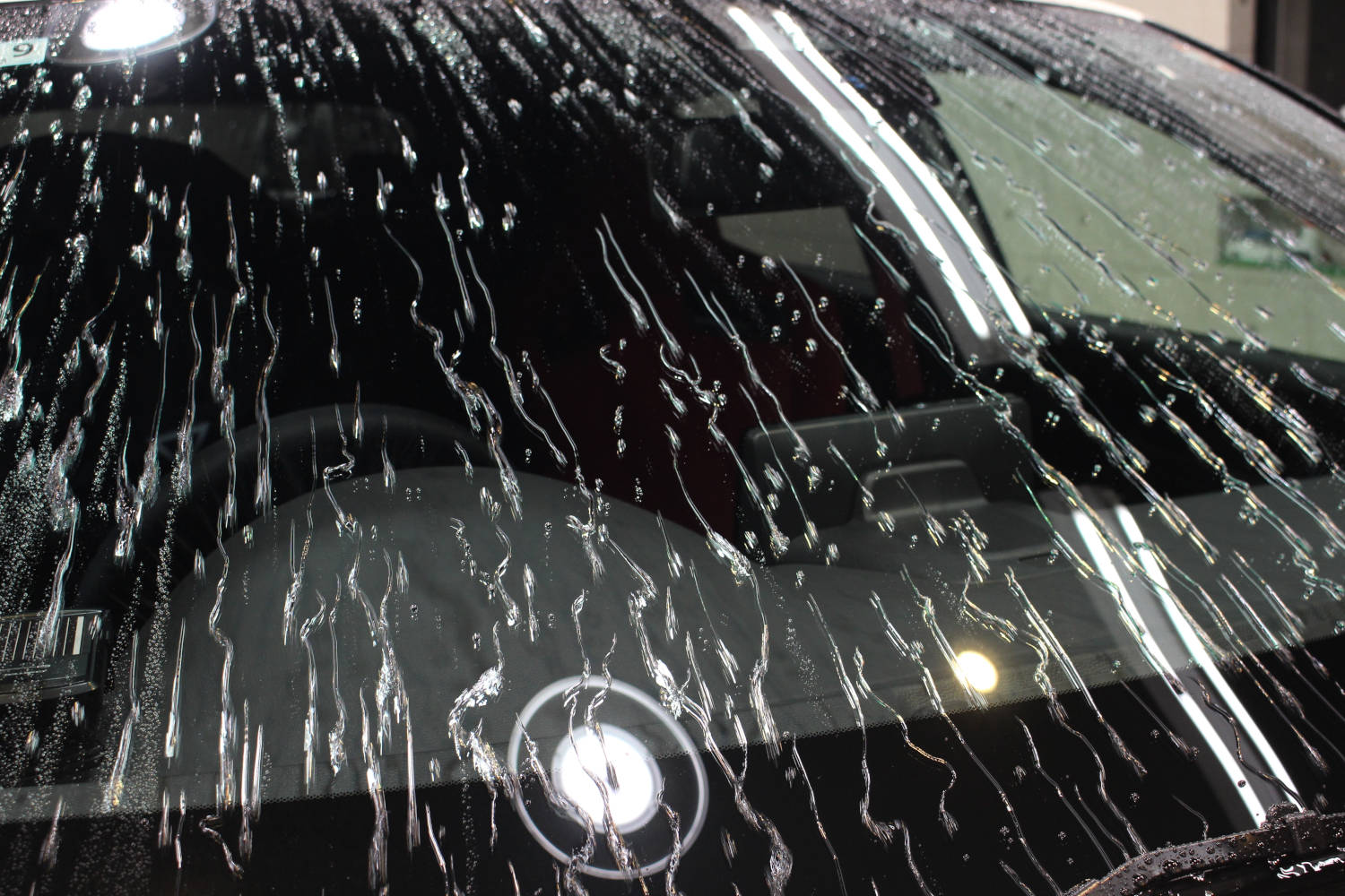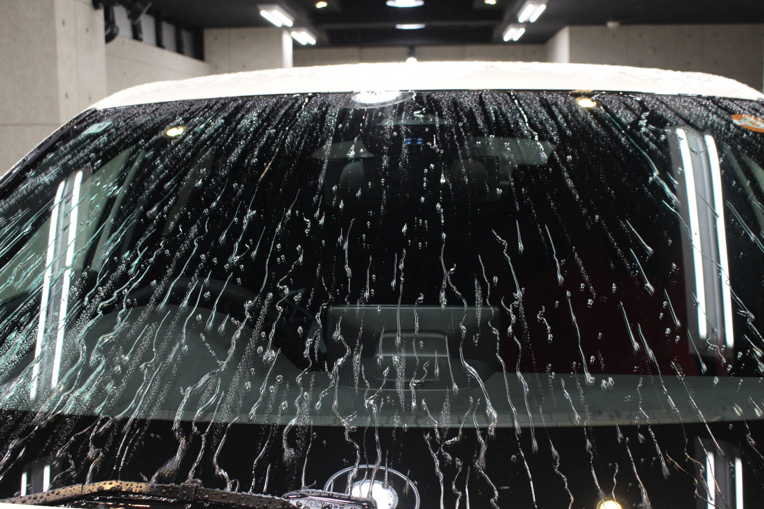 窓ガラス全面の撥水加工を行いました。新車ご納車から4ヶ月ほどのお車ということもありガラス全面がシミや油膜に覆われ視界不良の状態でした。窓ガラス撥水加工は、お車の美観を保つだけでなく雨天時の視界確保にも役立つため皆様にお喜びいただくオプションメニューの一つとなります。新車経年車問わず施工前に油膜等の付着物の除去を行っているため耐久性に優れています。