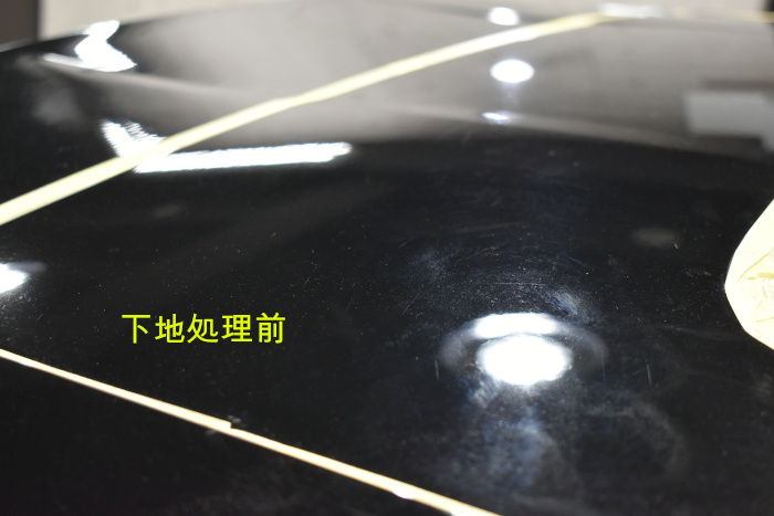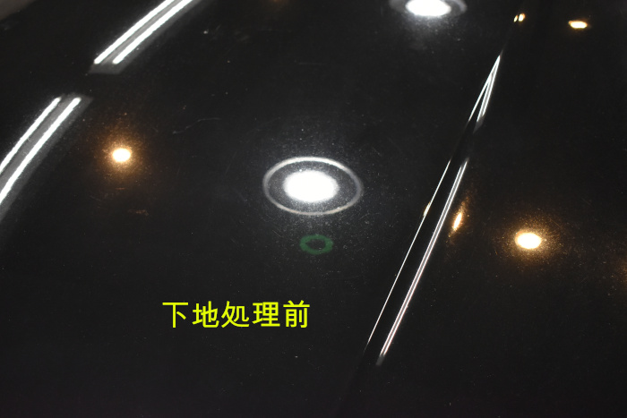 今回お預かりしたお車は新車から11ヶ月ほどのお車ですがシミやキズ等が多数ありブラック特有の輝きが失われていました。ご入庫前にご来店いただいた際に状態を拝見していたため通常より長めにお時間を頂き下地処理の作業を行っていきます。下地処理は高度な下地処理技術【Revolt Adjust System】を駆使し、細心の注意を払いながら行っていきます。お車の塗装には限りがありますので膜厚を意識しながら作業を行うことは非常に重要です。今回お預かりしたお車は新車からさほどお時間の経っていないお車ですが既に塗装膜厚が極端に薄い部分が多い状態でした。オーナー様とご相談させて頂き今後のメンテナンスを考慮し下地処理を行うことになりました。お車の塗装には限りがありますので見た目を優先するシミの完全除去が必ずしも塗装に良いわけでは有りません。美観と耐久性のバランスを取りながら仕上げていくことが重要となります。