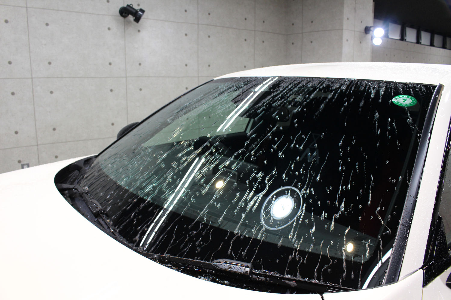 窓ガラスは油膜で覆われギラギラな状態でした。当店の窓ガラス撥水加工は新車でも下地処理にて油膜、シミなどの付着物を可能な限り落として施工しているためお車の美観維持だけでなく、雨天時の視界確保もしやすくなりオススメです。