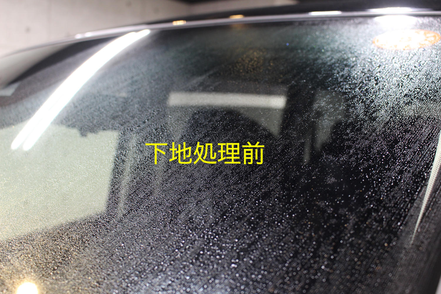 お車は既にガラス全面がシミや油膜に覆われた状態でした。当店の窓ガラス撥水加工は新車、経年車問わず下地処理にて油膜、シミなどの付着物を落として施工しているためお車の美観維持だけでなく、雨天時の視界確保もしやすくなりオススメです。