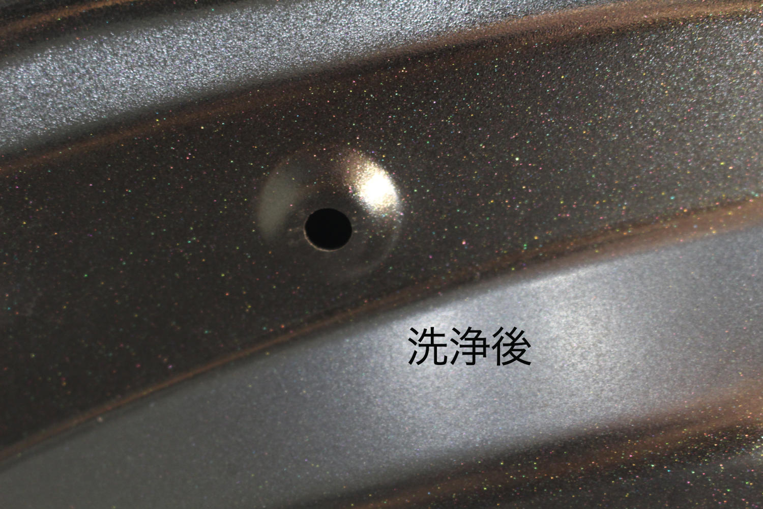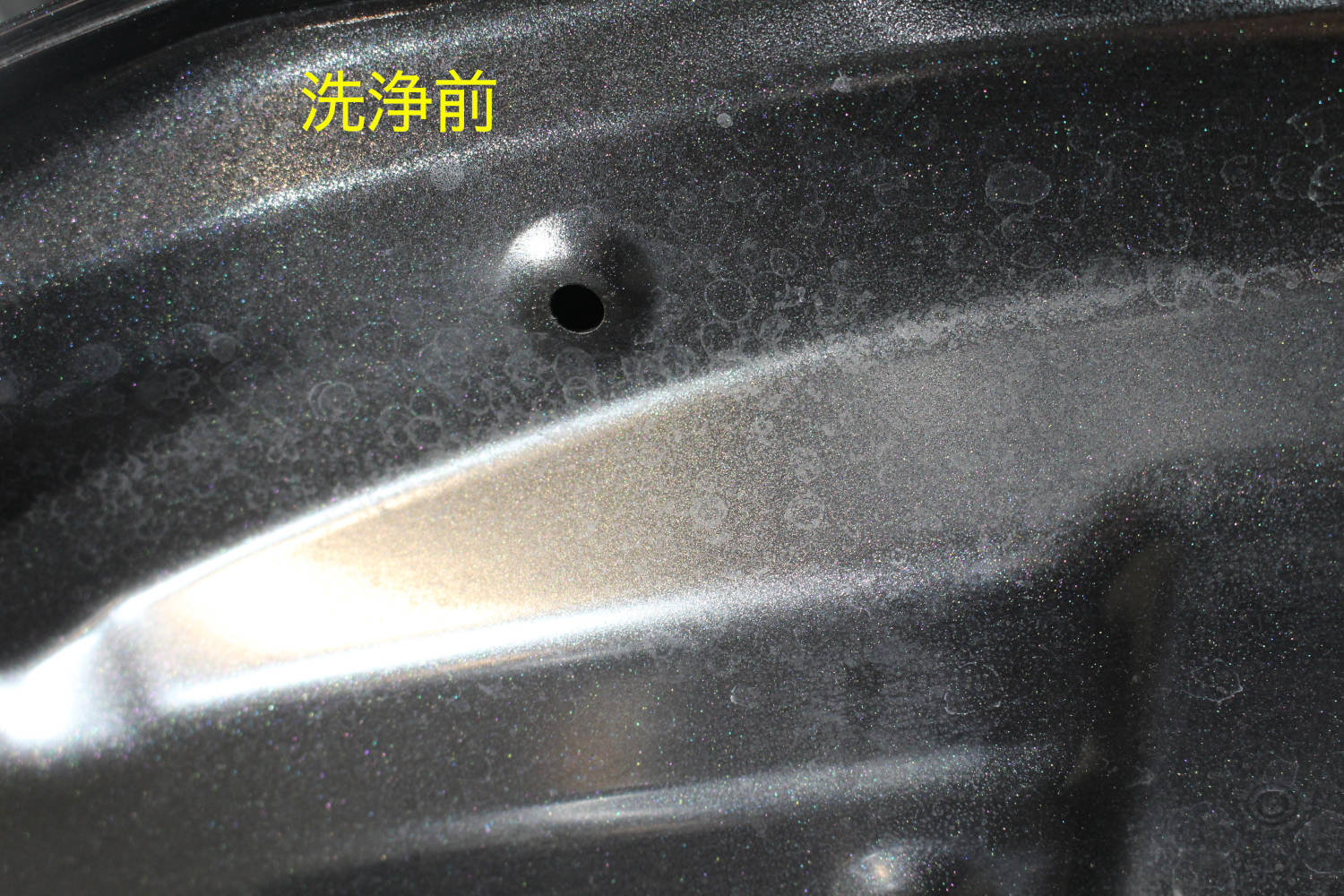 完全にツヤが失われた塗装面でしたが、最小限の磨きで最大限の艶を引き出す事ができる「Revolt adjust system(リボルトアジャストシステム)」にて磨きを行い可能な限り復元いたしました。当店の磨きは限りある塗装をむやみに磨くことはせず塗膜の厚さは確保し、負荷は極力抑えながら行いますので深い傷やクレーター化したシミは追い込まずにあえて目立ちにくいようぼかしたりを行う場合があります。