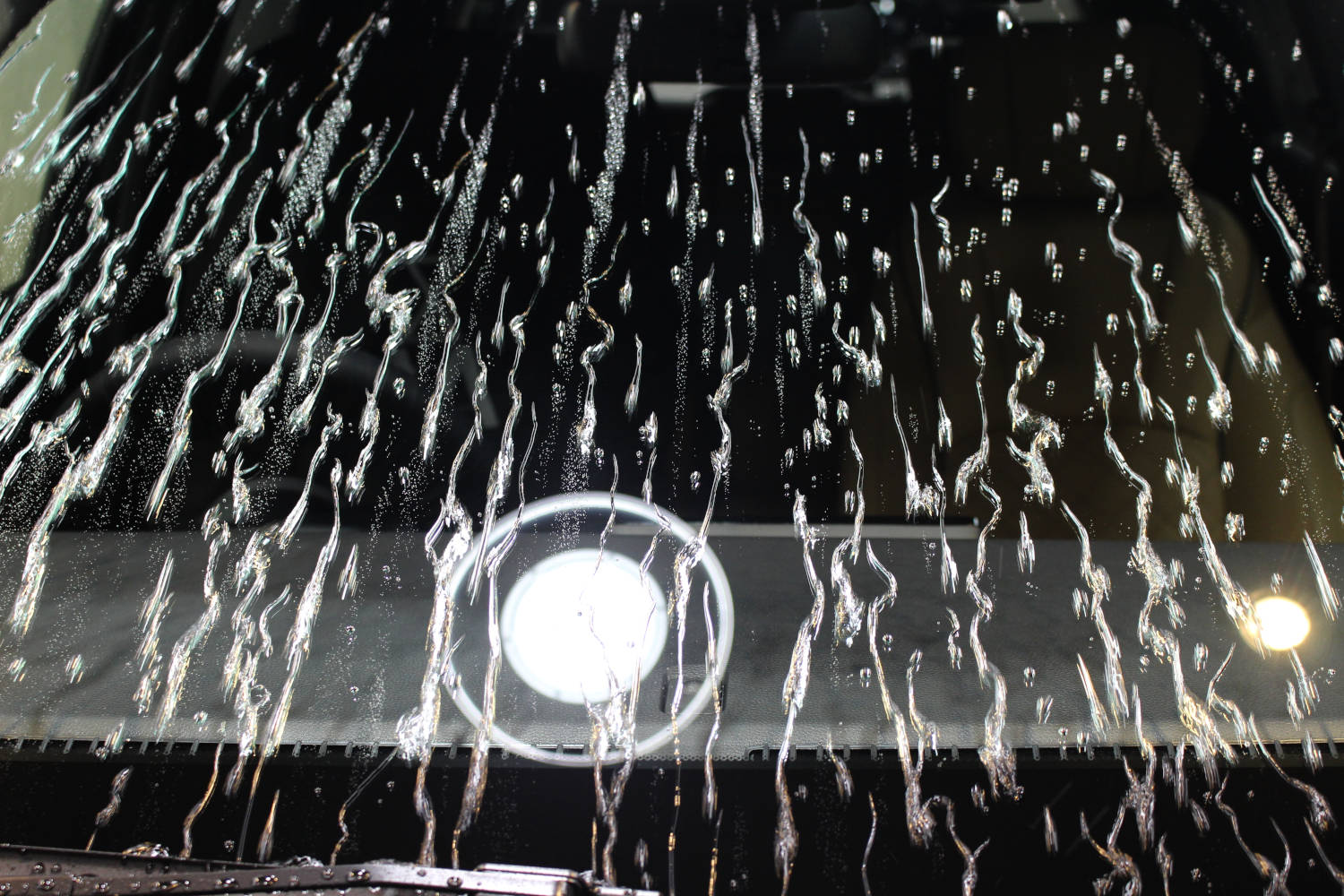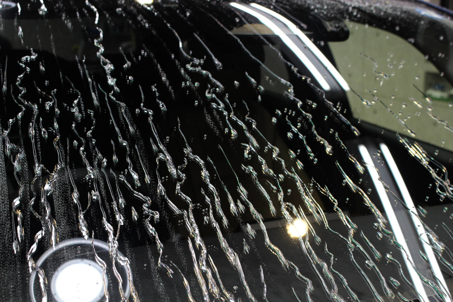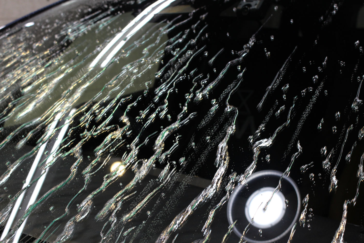 窓ガラス全面の撥水加工を行いました。窓ガラス撥水加工は、お車の美観を保つだけでなく雨天時の視界確保にも役立つため皆様にお喜びいただくオプションメニューの一つとなります。新車ご納車から1週間ほどのお車でしたが油膜が多く付着していました。当店の窓ガラス撥水加工は、新車経年車問わず施工前に油膜等の付着物の除去を行っているため耐久性に優れています。